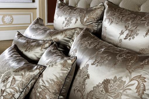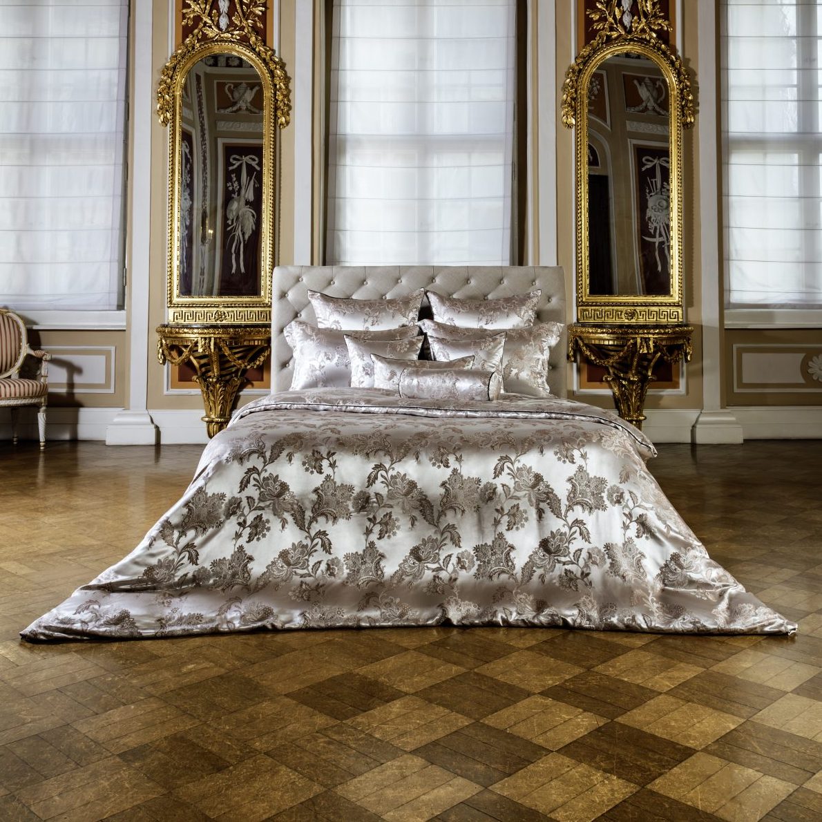 Das aufwendig gearbeitete zweifarbige Jacquard-Muster besticht durch seine beeindruckende Detailvielfalt und ist inspiriert von den kunstvollen Jacobean-Designs des 17. Jahrhunderts. Die hochwertige Seide verleiht der Bettwäsche einen eleganten Glanz und ein unvergleichlich weiches Gefühl auf der Haut.