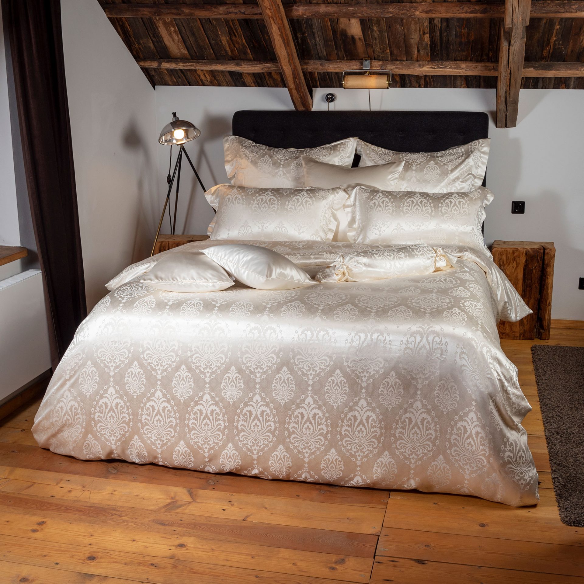 Jede Berührung dieser exquisiten Bettwäsche erinnert an die Schönheit und Feinheit der Natur. Erleben Sie ultimative Weichheit und den unvergleichlichen Komfort, den nur hochwertige Seide bieten kann.