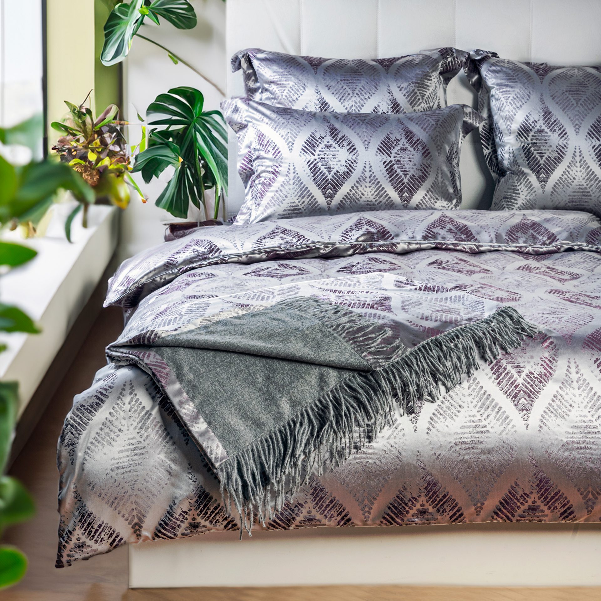Erleben Sie ultimative Eleganz und zeitlose Schönheit in Ihrem Schlafzimmer mit der Seidenbettwäsche in gedecktem Violett. Das klassische Ethno-Muster, liebevoll modernisiert mit einem Vintage-Effekt, verleiht Ihrem Schlafzimmer einen Hauch von Luxus und zeitloser Raffinesse.