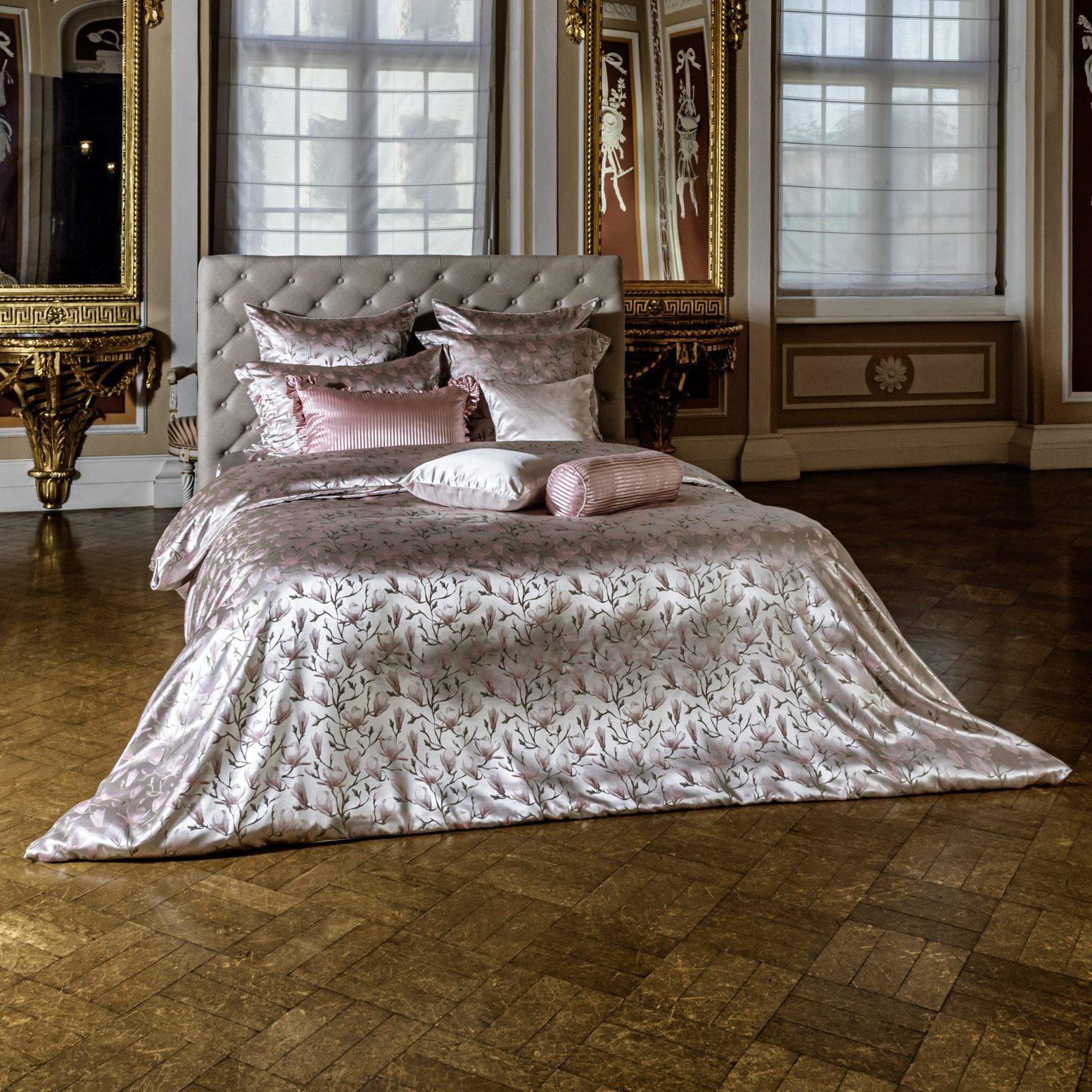 Blühenden Magnolien, die in seidene Bettwäsche gebannt sind, vermittelt ein Bild von Eleganz und Naturverbundenheit in Ihrem Schlafzimmer. Das mehrfarbig gewebte Jacquardmuster fängt die Schönheit der Natur ein und bringt sie in Ihre persönliche Umgebung, was Ihrem Schlafzimmer sicherlich eine warme und einladende Atmosphäre verleiht.